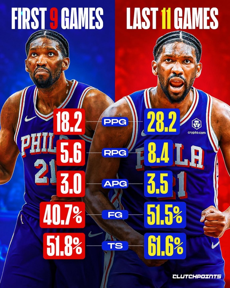 开云APP-越打越好!恩比德前9场仅18+5!近11场28+8 命中率提升一成!