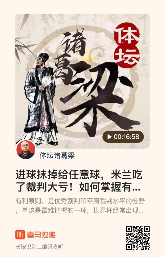 由《体坛周报》与喜马拉雅FM联合推出的播客节目——《体坛诸葛梁丨梁熙明电台》正式上线。 有利原则,是优秀裁判和平庸裁判水平的分野,单这是最难把握的一环,世界杯经常出现名哨对有利原则的偏差,意甲大量起用年轻裁判,经验水平有限,出现错判是必然的。 点击下方链接,或扫描二维码,即可进入“体坛...